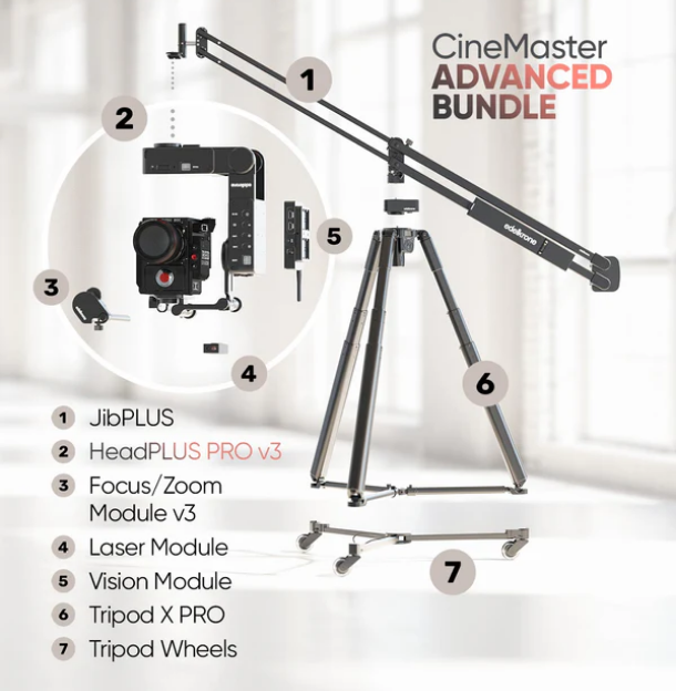 Das Edelkrone CineMaster Advanced Bundle bietet mit JibPLUS, HeadPLUS PRO v3 und essentiellem Zubehör eine Komplettlösung für die professionelle, motorisierte Steuerung von Kamerabewegungen - perfekt für komplexe Aufnahmen und präzise Kontrolle in der High-End-Videoproduktion.