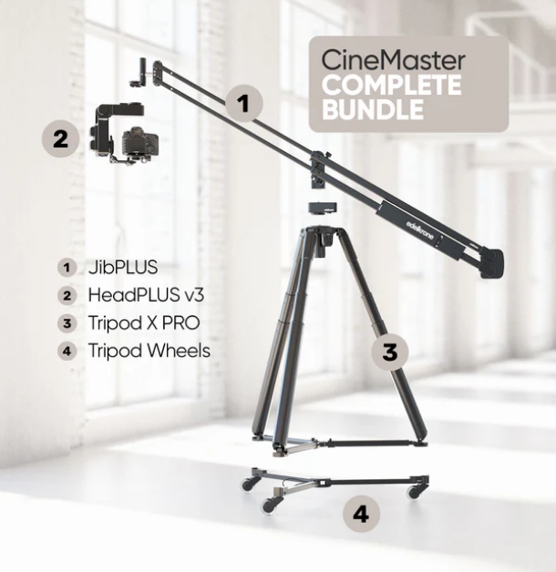 Das Edelkrone CineMaster Bundle - Complete beinhaltet JibPLUS, HeadPLUS v3, Tripod X PRO und Tripod Wheels und bietet damit ein umfassendes Motion Control System für flüssige und präzise Filmaufnahmen.