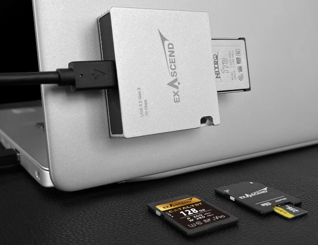 Der Exascend EXCRFBS1 Essential 4-in-1 Multi-Slot-Kartenleser unterstützt CFexpress Typ B, SD/SD Express und microSD (mit Adapter) mit einer Geschwindigkeit von bis zu 10 Gbit/s USB 3.2. Schlankes Aluminiumdesign mit Magnethalterung, inklusive Hybridkabeln und Adapter – perfekt für mobile Hochgeschwindigkeits-Workflows.