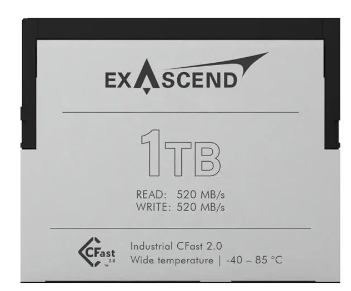 Die Exascend EXSD3X001TB-I ist eine industrielle CFast 2.0-Speicherkarte (SD3X-Serie) mit 1 TB Speicherkapazität und SATA-Schnittstelle, die mit 3D-TLC-NAND-Technologie eine kontinuierliche Lese- und Schreibgeschwindigkeit von 520 MB/s bietet. Sie arbeitet bei 3,3 V von -40 °C bis +85 °C, misst 42,8 x 36,4 x 3,6 mm und ist ideal für hochkapazitive, äußerst zuverlässige Unternehmensspeicher in extremen Umgebungen.