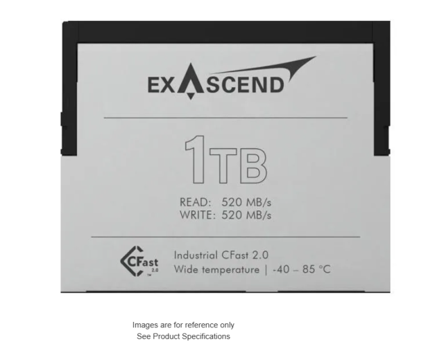 Die Exascend 512 GB CFast 2.0-Karte (SD3X-Serie) bietet über SATA III mit 3D-TLC-NAND eine kontinuierliche Lesegeschwindigkeit von 520 MB/s und eine Schreibgeschwindigkeit von 400 MB/s. Sie arbeitet bei 3,3 V von -40 °C bis +85 °C, misst 42,8 x 36,4 x 3,6 mm und ist ideal für industrielle 4K/8K-Videos mit hoher Kapazität, Überwachungssysteme und eingebettete Systeme.