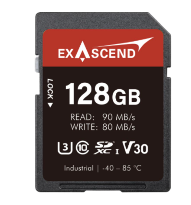 Die Exascend EX128GSDV30-IDE ist eine industrielle SDXC-Karte (SD300-Serie) mit 128 GB Speicherplatz und 3D-TLC-/pSLC-NAND-Speicher, die Lesegeschwindigkeiten von bis zu 90 MB/s und Schreibgeschwindigkeiten von bis zu 80 MB/s bietet. Mit den Spezifikationen V30/U3/C10/A2 arbeitet sie bei Temperaturen von -40 °C bis +85 °C mit SMART-Zustandsüberwachung, einer MTBF von 2.000.000 Stunden und einer Eingangsspannung von 2,7–3,6 V – ideal für robuste 4K-Überwachungs-, Embedded- und Industriesysteme.