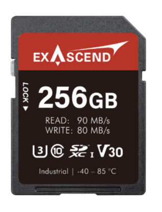 Die Exascend EX256GSDV30-IDE ist eine industrielle SDXC-Karte (SD300-Serie) mit 256 GB Speicherkapazität und einer Lesegeschwindigkeit von bis zu 90 MB/s sowie einer Schreibgeschwindigkeit von bis zu 80 MB/s. Mit den Spezifikationen V30/U3/C10/A2 arbeitet sie bei Temperaturen von -40 °C bis +85 °C mit einer MTBF von 2.000.000 Stunden, einer Eingangsspannung von 2,7–3,6 V und SMART-Überwachung – ideal für robuste 4K-Überwachung, eingebettete Systeme und industrielle Automatisierung.