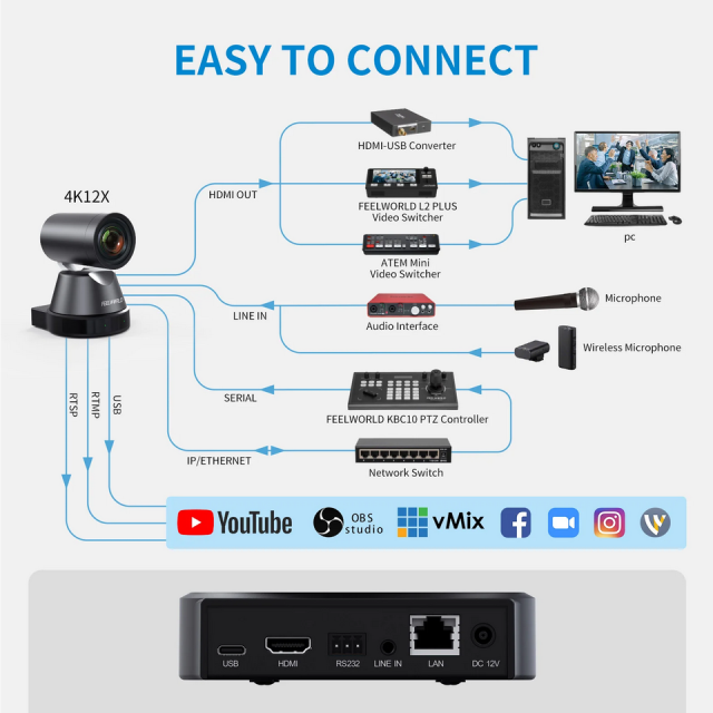 FEELWORLD 4K12X erfüllt alle Ihre Anforderungen für Live-Streaming in der Kirche, Videokonferenzen, Online-Bildung, Live-Konzerte, Online-Direktverkauf, Telemedizin, etc.