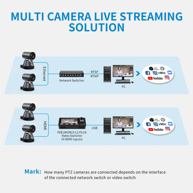 Für mittlere oder große Live-Streaming immer brauchen mehrere Kameras schießen, um verschiedene Ansichten zu erhalten. Sie können problemlos mehrere PTZ-Kameras über einen Netzwerk-Switch oder Video-Switcher anschließen.