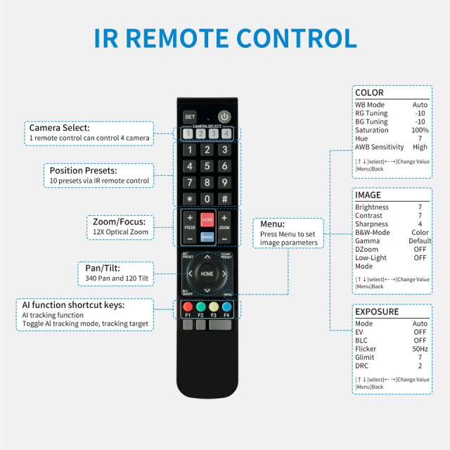 10 voreingestellte Positionen über die IR-Fernbedienung, die Schwenk-, Neige- und Zoom-Einstellungen speichern kann und mit einem Tastendruck nahtlos zwischen ihnen wechselt. Bis zu 255 voreingestellte Positionen über Netzwerksteuerung oder Tastatursteuerung.