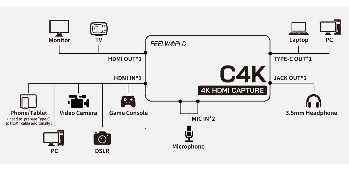 Wenn Sie bei Live-Streams mit unscharfen Bildern, Farbabweichungen und langen Latenzzeiten konfrontiert sind, kann FEELWORLD C4K Ihnen helfen, diese Probleme zu lösen. Die Karte ist mit einem 4K-HDMI-Eingang und -Ausgang ausgestattet, unterstützt mehrere Aufnahmeformate und kann bis zu 4K 60 Hz aufnehmen und aufzeichnen, wobei jedes Detail ultra-klar erfasst wird. Kompatibel mit mehreren Systemen und Softwareprogrammen, sodass Sie auf jede Plattform streamen können – die perfekte Streaming-Lösung für Streamer, Gamer und Kreative.