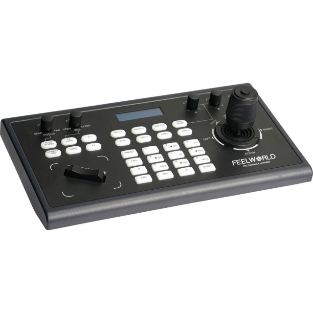 Der KBC10 PTZ-Kamera-Controller mit Joystick von FeelWorld ist mit jeder PTZ-Kamera kompatibel, die die seriellen Protokolle ONVIF, IP VISCA, VISCA und Pelco-D/P verwendet. Es kann über Ethernet, RS-232 DB-9 und RS-422 5-pin Terminal Ports eingerichtet werden, um bis zu 255 Kameras zu steuern. Er kann Kameras über Twisted-Pair-Kabel aus einer Entfernung von bis zu 1200 Metern steuern.