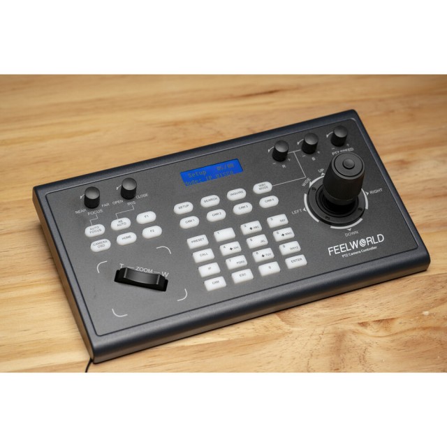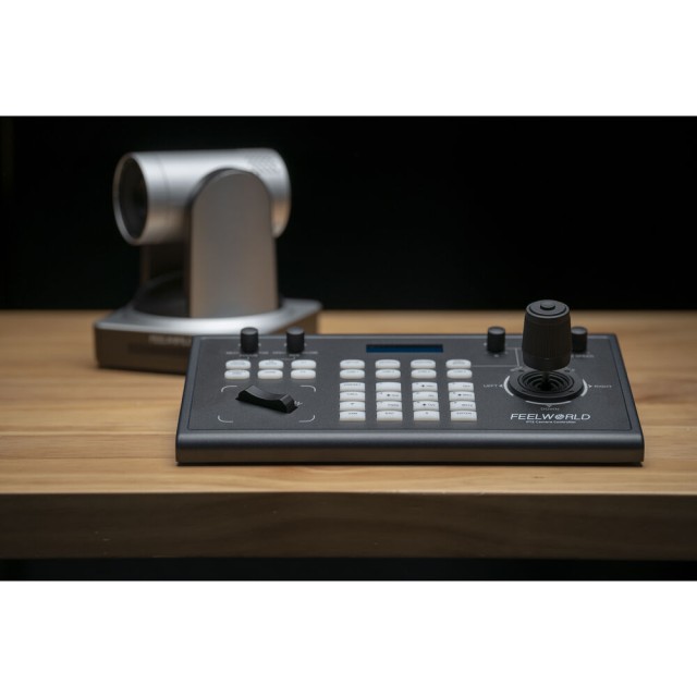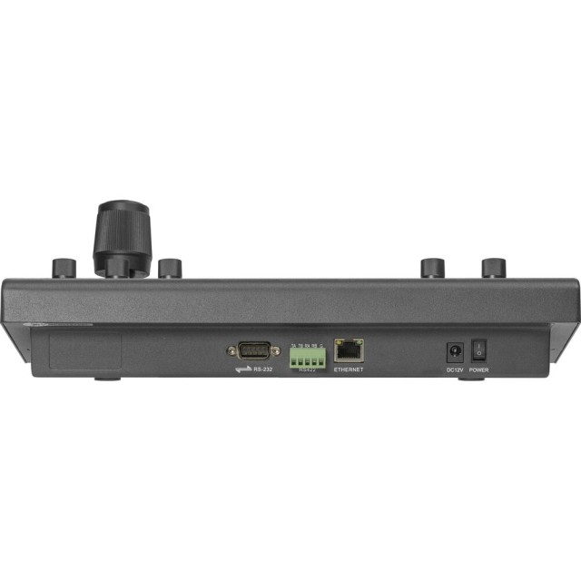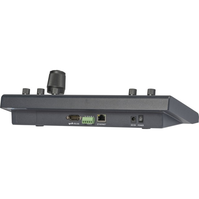 Das Bedienfeld verfügt über einen 4D-Joystick, Tasten zur Kameraauswahl, eine Zoomwippe, Fokus-, Blenden- und Geschwindigkeitsknöpfe sowie eine LCD-Statusanzeige. Es gibt sogar programmierbare Tasten für die Zuweisung von Benutzerkurzbefehlen. Der Controller kann über das mitgelieferte Netzteil oder über PoE in einem unterstützten Netzwerk mit Strom versorgt werden.