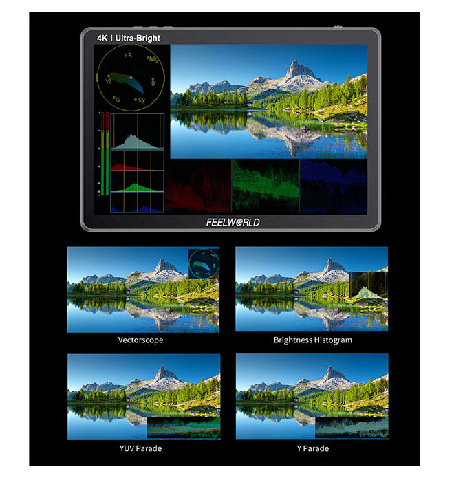 * Mit Waveform, Vectorscope, RGB-Histogramm, Focus Assist, Monochrom usw. Funktionen, können Sie genau Belichtung und Fokus jede Aufnahme helfen.