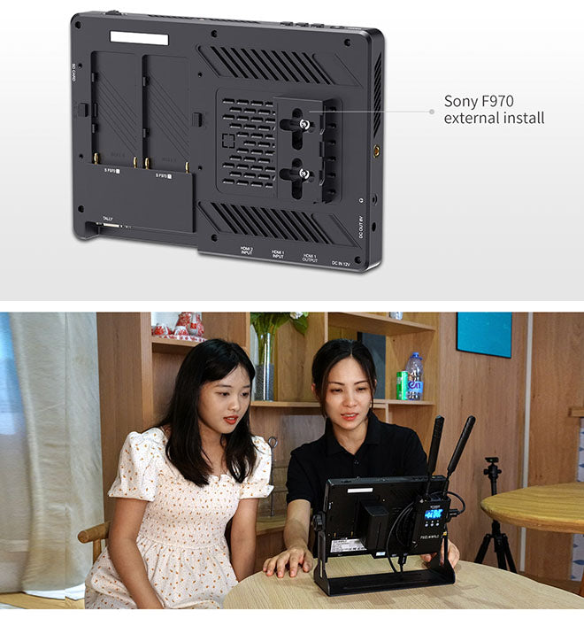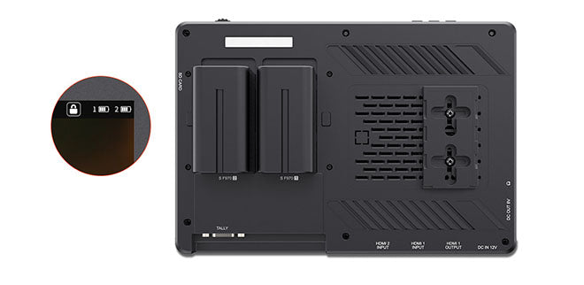 Auf der Rückseite des Monitors des LUT11H befinden sich zwei Batterieplatten, in die zwei handelsübliche NP-F-Batterien eingesetzt werden können, um den Bildschirm mit lang anhaltender Energie zu versorgen. Darüber hinaus können Sie die Batterie schnell wechseln, indem Sie einfach doppelt auf das Batteriesymbol in der oberen rechten Ecke des Monitors tippen (ca. 3 Sekunden). Eine installierte F970-Batterie (6600mAh) reicht für ca. 2 Stunden, zwei installierte F970-Batterien reichen für ca. 3,5-4 Stunden. Sie können wählen, installieren Sie 1 oder 2 Batterie Basis auf Ihren Bedarf.