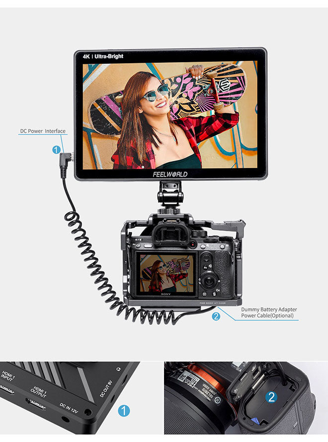 Der LUT11H ist nicht nur mit einem DC IN 12V (geeignet für 12/3A Adapter) ausgestattet, sondern bietet auch einen zusätzlichen Stromausgang (DC OUT 8V), der es dem Fotografen ermöglicht, seine Kamera mit Strom zu versorgen. Mit einem Batterieadapterkabel (optional) verlängert der LUT11H die Betriebszeit der Kamera und bietet gleichzeitig ein besser nutzbares Display.