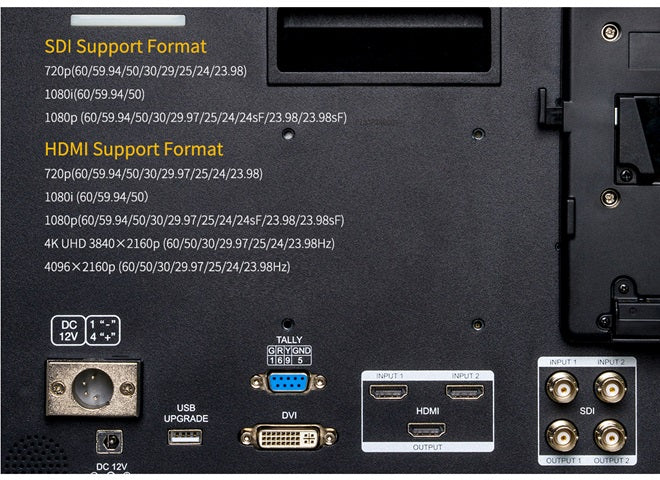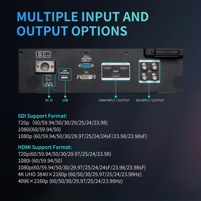 Ausgestattet mit 3G-SDI, HDMI2.0 DVI Signalanschlüssen, kompatibel mit professionellen Camcordern und den neuesten DSLR-Kameras auf dem Markt.