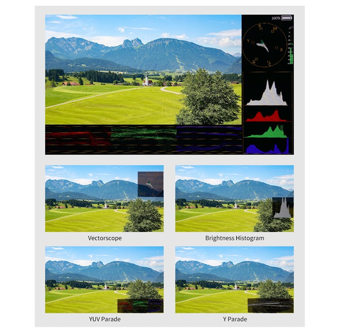 Integrierte Wellenformüberwachung, Sie können zwischen Wellenform (RGB Parade, YUV Parade, Y Parade), Vektorscope, Histogramm, Audiophase und Pegelanzeigen wählen und erhalten eine genaue Wellenformüberwachung, die alles zeigt, was Sie technisch über Ihre Video- und Audiosignale wissen müssen. Die Funktionen können separat geöffnet werden und unterstützen auch eine Taste zum Öffnen aller Oszilloskop-Modi. Wenn die Funktion separat eingeschaltet ist, können Sie auch die horizontale oder vertikale Position verschieben. Das P133 PRO ist die ideale Wahl für die Überwachung von Live-Produktionen, so dass Sie keine separaten teuren Scopes mehr verwenden müssen!