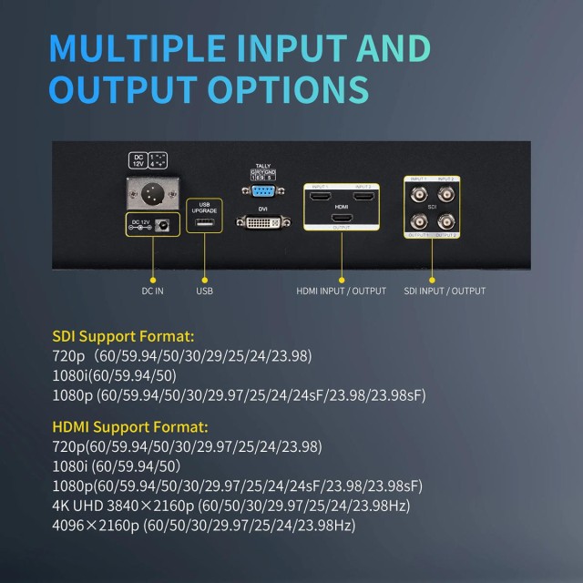 Ausgestattet mit 3G-SDI, HDMI2.0 DVI Signalanschlüssen, kompatibel mit professionellen Camcordern und den neuesten DSLR-Kameras auf dem Markt.