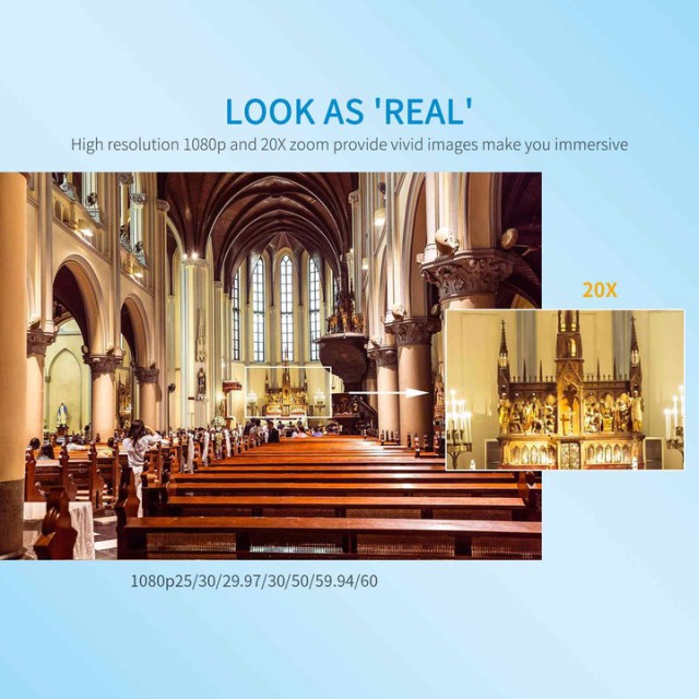 Die hohe Auflösung von 1080P@60fps, die hervorragende Farbwiedergabe und der 20-fache Zoom sorgen für eine erstklassige Optik und lebensechte Videos, die das Gefühl vermitteln, gemeinsam in einem Raum zu sitzen, auch wenn Sie tausend Meilen entfernt sind.