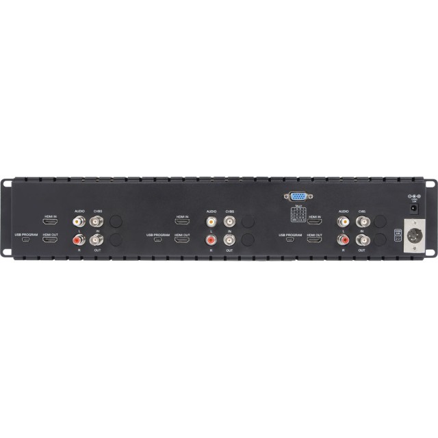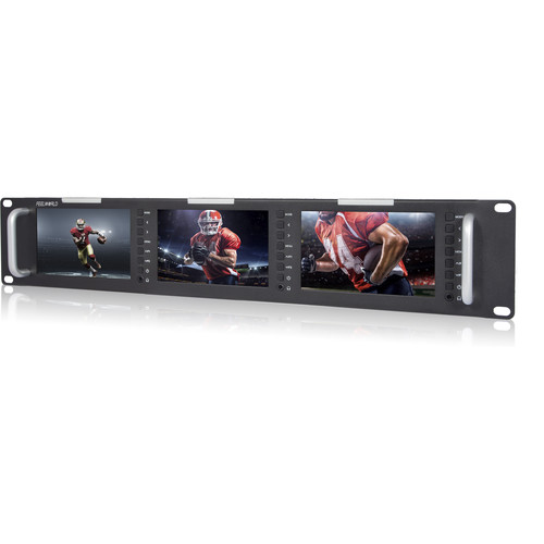 Drei 5-Zoll-Displays in einem schlanken 2-HE-Rackmount-Ganzmetallgehäuse mit gusseisernen Griffen