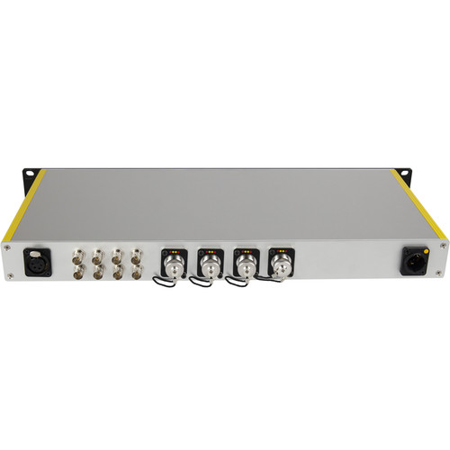 Das Fiber Dock One verfügt über vier Hybrid-Glasfasereingänge, an die bis zu vier PTZ-Monk-Glasfaseranschlüsse angeschlossen werden können. Diese Anschlüsse ermöglichen die Steuerung, Stromverteilung und Überwachung von bis zu vier 3G-SDI-PTZ-Kameras. Mit dieser Einrichtung können Sie problemlos mehrere Kameras von einem zentralen Standort aus verwalten.