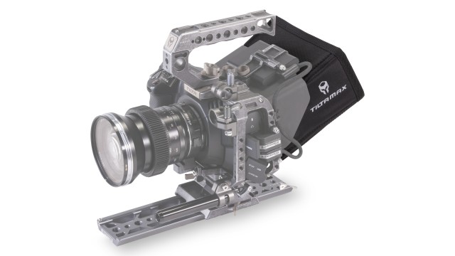 Die vollständige Sonnenblende kann mit den mitgelieferten Klettverschlüssen an der partiellen Sonnenblende für BMPCC 4K befestigt werden. Dadurch erhalten Sie eine größere Abdeckung des Sonnenschutzes. Ein Fach an der Unterseite der vollständigen Sonnenblende kann geöffnet werden, um den Zugriff auf den Touchscreen der Kamera zu ermöglichen.