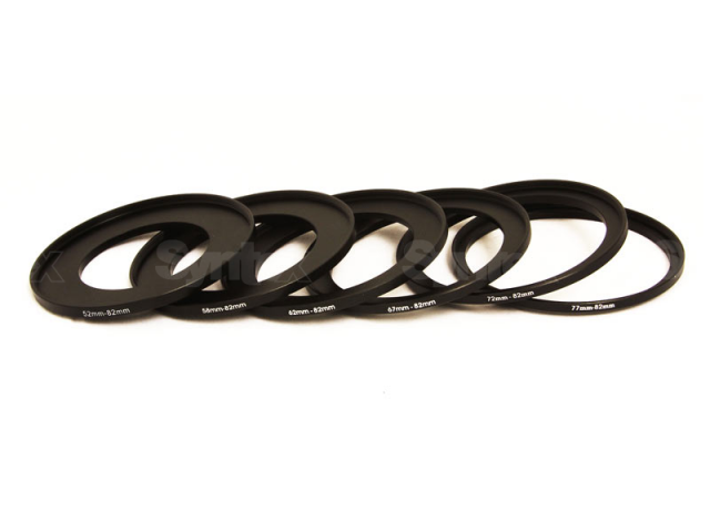 Ein Satz von fünf verschiedenen 77-mm-Zwischenringen. Ermöglicht die Verwendung von 77-mm-Filtern und Zubehör an Objektiven mit 52-mm-, 58-mm-, 62-mm-, 67-mm- und 72-mm-Filtergewinden.