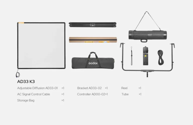 Das Godox Knowled AD33 K3 Adjustable Diffuser Kit verbessert die Lichtsteuerung am Set mit einem hochmodernen, motorisierten Diffusionssystem, das für maximale Vielseitigkeit und Präzision entwickelt wurde. Das AD33 K3 ist ideal für Kameraleute, Beleuchter und Lichttechniker und kombiniert einen zusammenklappbaren, leichten Rahmen mit einer großen, motorisierten Diffusionsplatte (105,4 cm × 100,6 cm), die eine reibungslose und präzise Einstellung der Diffusionsstufen per Knopfdruck ermöglicht.