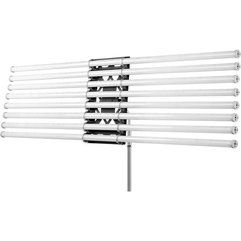 Das Godox Knowled TP-B8 Acht-Licht-Halterungsset ermöglicht die Montage von bis zu acht 2'- oder 4'-LED-Röhren der TP-Serie und schafft so eine vielseitige, großflächige Lichtquelle. Es besteht aus einer robusten Metallkonstruktion und verfügt über ein Kugelgelenk für eine flexible Positionierung sowie einen 5/8"-Stativadapter, der mit Standard-Lichtstativen kompatibel ist.