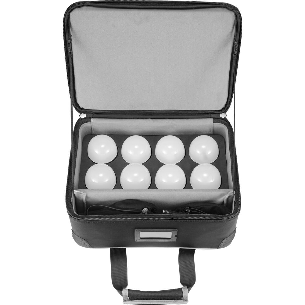 Die mitgelieferte Lade- und Tragetasche sorgt für Ordnung und Schutz aller acht Lampen, während acht runde Cup-Bouncer-Diffusoren dazu beitragen, die Lichtleistung zu mildern und zu formen. Mit einem E26/E27-Sockel passen die C10R-Lampen in Standardfassungen und sind somit ein vielseitiges Beleuchtungswerkzeug für praktische Zwecke, Requisiten und kreative Beleuchtungsdesigns.