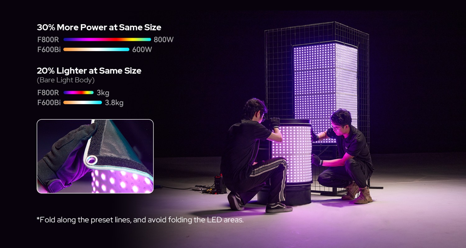 Der F100R wurde für reale Produktionsumgebungen entwickelt und verfügt über die Schutzart IP54, die sowohl die Lichtmatte als auch den Controller vor Staub und Spritzwasser schützt, sodass er sowohl für Studio- als auch für Außenaufnahmen geeignet ist. Die neu verbesserte Metall-X-Halterung erhöht die Haltbarkeit und ermöglicht gleichzeitig eine einfachere Installation in beengten Räumen.