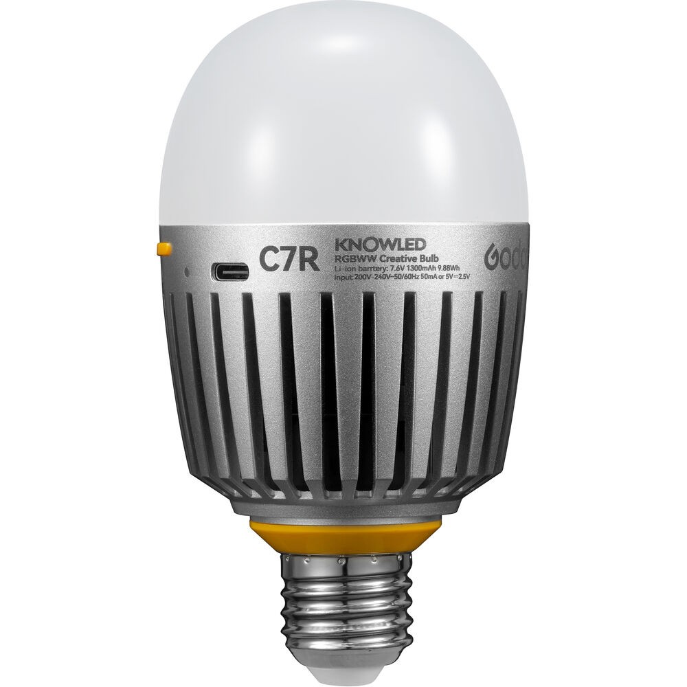 Die Godox C7R RGBWW Creative Bulb (Batterieversion) ist eine vielseitige, vollständig abstimmbare LED-Glühbirne mit integriertem Akku und USB-C-Stromversorgungsoptionen. Mit einer hohen Farbtreue von CRI 96 und TLCI 98 bietet sie RGB-, HSI- und 2000–10.000K-CCT-Modi, stufenloses Dimmen und Bluetooth-Steuerung über die Godox Light App – perfekt für dynamische Beleuchtung bei jedem Set oder kreativen Projekt.