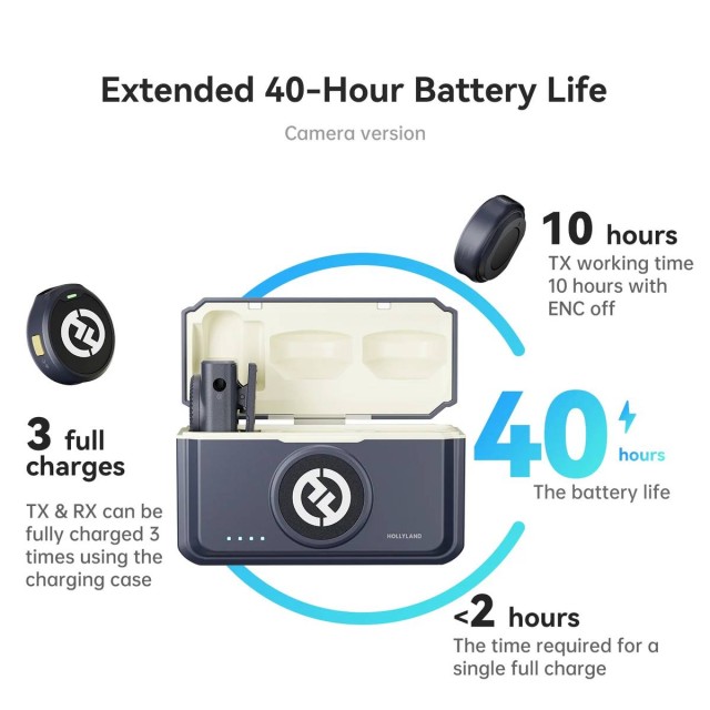 Dank optimierter Energieverwaltung und Betriebseffizienz kann das LARK M2 bis zu 10 Stunden lang ununterbrochen betrieben werden, so dass sich die Benutzer auf die Erstellung großartiger Inhalte konzentrieren können, ohne sich Gedanken über die Akkulaufzeit machen zu müssen. Der kompakte und tragbare Ladekoffer kann das gesamte Kit zweimal in weniger als 1,5 Stunden aufladen. Die Kamera-Version bietet eine Gesamtlaufzeit von bis zu 40 Stunden, während die mobile Version mit der Ladetasche eine Akkulaufzeit von 30 Stunden aufweist. Das System kann auch während des Gebrauchs aufgeladen werden.
