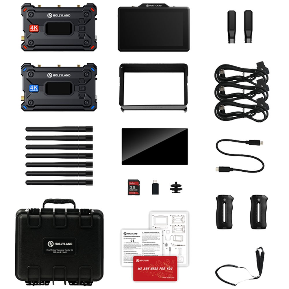 Hollyland Pyro Videoübertragungs- und Überwachungskit (5,5 Zoll). Das Hollyland Pyro Videoübertragungs- und Überwachungskit kombiniert den drahtlosen Pyro 5-Monitor mit dem drahtlosen Pyro S-Videosender und -empfänger und bietet so eine komplette, professionelle Lösung für die Videoüberwachung und drahtlose Übertragung am Set.