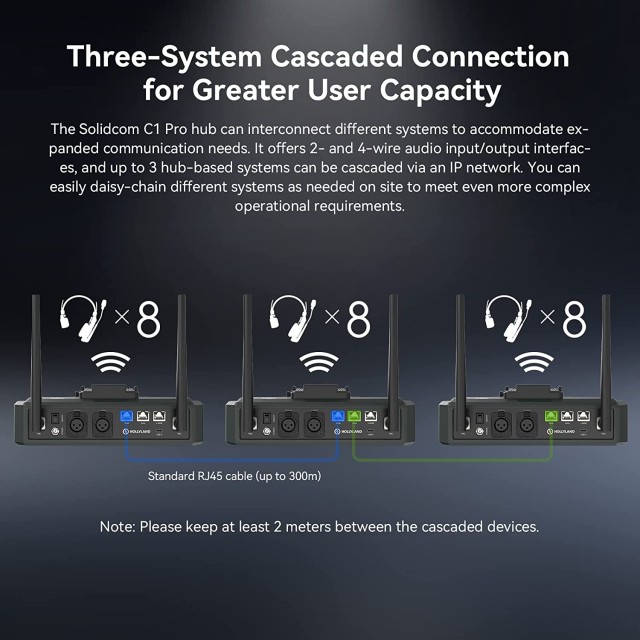 Das Hollyland Solidcom C1 Pro ist eine drahtlose Vollduplex-Sprechanlage im 1,9-GHz-Band (DECT 6.0) mit einer Reichweite von bis zu 350 m (Sichtverbindung). Durch die Integration aller Komponenten in das Headset bietet es maximalen Komfort und leichte Tragbarkeit, ohne zusätzliche Beltpacks oder Basisstationen. Das Headset wiegt ca. 170 g und wird mit einem Ersatzakku für einen ausfallfreien Dauerbetrieb geliefert. Das Solidcom C1 Pro Intercom bietet Audioübertragung im Frequenzbereich von 150 Hz - 7 kHz, AEC (Acoustic Echo Cancellation)-Technologie, Richtmikrofon zur Unterdrückung von Umgebungsgeräuschen, zusätzliches omnidirektionales Mikrofon zur Umgebungserkennung und Environmental Noise Cancellation (ENC; abschaltbar), Push-to-Talk-Betrieb, Übertragungsverschlüsselung, etc. Es ist in mehreren Varianten als Set für Teams von zwei bis sechs Personen erhältlich.