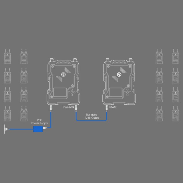 Neben der integrierten Antenne (Reichweite bis 400 m in der vorderen Halbkugel bzw. 50 m in der hinteren Halbkugel), die sich besonders für die Kommunikation in Freiflächen und wenig bebauten Innenräumen (Konzertsäle, Kirchen, etc.) eignet, verfügt die Basisstation über externe FRP-Antennen für eine Reichweite von ca. 300 m im vollen 360º-Bereich (ideal z.B. für Ausstellungsflächen, Sportstadien, etc.).
