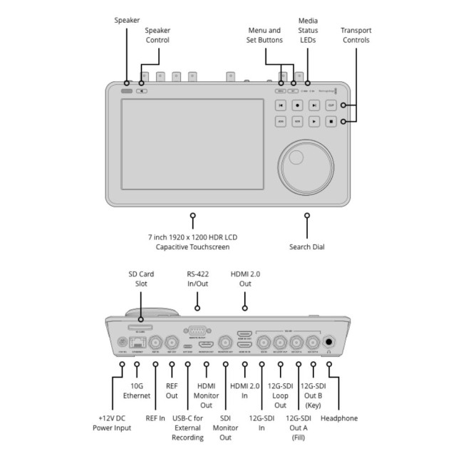Dieser neue Live-Media-Player und Master-Recorder verfügt über ergonomische physische Steuertasten, mit denen Sie durch große Mengen von Medien blättern und Clips abspielen können. Das große 7-Zoll-HDR-Display verfügt über Tasten für Wiedergabe, Pause und Aufnahme sowie über eine Mini-Wiedergabezeitleiste, mit der Sie durch Ihre Clips blättern können. Außerdem gibt es ein "HUD" (Heads-up-Display), das wichtige Informationen wie Timecode, Medienstatus und Audioanzeigen anzeigt. Darüber hinaus können Sie auf dem Touchscreen vollständige Broadcast-Scopes aktivieren und Funktionen wie die Fokusunterstützung und das RGB-Belichtungshistogramm aktivieren. Die Einstellungen von HyperDeck Shuttle 4K Pro können direkt über das Bildschirmmenü geändert werden. Darüber hinaus können Sie 3D-LUTs aufzeichnen und speichern. Das helle LCD-Display verfügt über einen größeren Farbraum und unterstützt daher sowohl Rec. 2020 als auch Rec. 709.