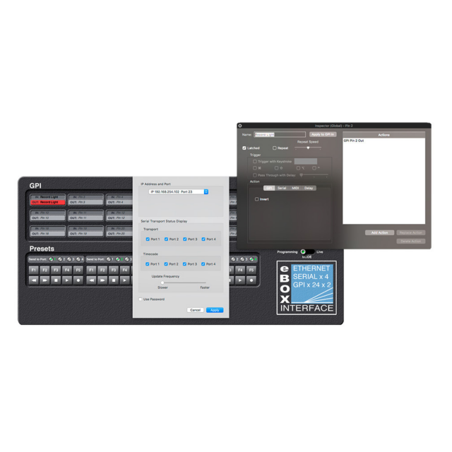 Die Anschlussrichtung kann für jeden Anschluss unabhängig als DTE oder DCE konfiguriert werden. Darüber hinaus kann die eBOX als GPI-zu-Seriell-Konverter oder GPI-zu-Ethernet-Konverter arbeiten. In diesen Modi wandelt das Gerät GPI-Eingangs-Trigger in Deck-Befehle um.