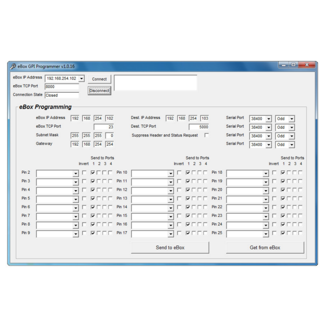 - die eBOX kann als GPI-zu-Seriell-Konverter fungieren - jeder der 24 GPI-Eingänge kann zum Senden von P2 oder