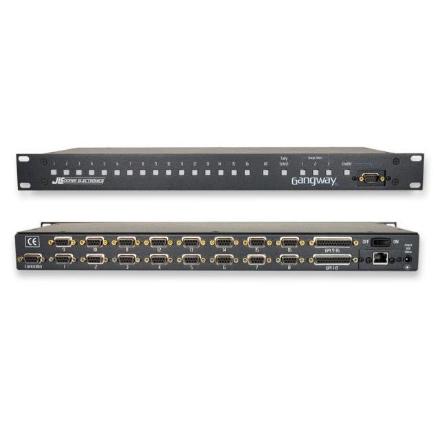 Der GangWay16 von JL Cooper ist ein kompakter, einfach zu bedienender RS-422-Gang-Roll-Switcher und GPI-Trigger-Box mit einem Anschluss. Er ermöglicht Ihnen die Steuerung von bis zu 16 Decks oder Videoservern über einen einzigen 9-poligen Controller. Auf der Vorderseite befindet sich eine beleuchtete Taste zur eindeutigen Anzeige des Status der einzelnen Geräte, eine Gang-Roll-Taste zur schnellen Aktivierung aller Geräte, 3 vom Benutzer voreingestellte Gruppen und eine Tally-Auswahltaste.