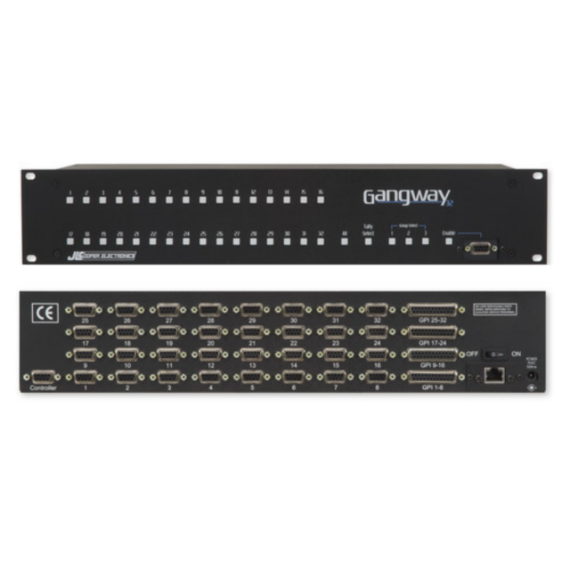 Der GangWay32 32-Port RS-422 Gang Roll Switcher und GPI Trigger Box von JLCooper bietet Bedienelemente auf der Vorderseite des Decks, mit denen Sie gleichzeitig bis zu 32 Videorecorder, DDRs oder Serverkanäle auswählen können. Auf der Vorderseite befinden sich beleuchtete Tasten für eine klare Statusanzeige für jedes Gerät und ein RS-422-Anschluss auf der Vorderseite, der eine bequeme Fernverbindung ermöglicht. Auf der Rückseite befinden sich die 32 RS-422-Anschlüsse, ein RS-422-Steuereingang und GPI-Anschlüsse (General Purpose Interface).