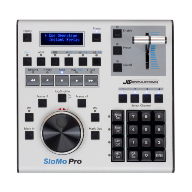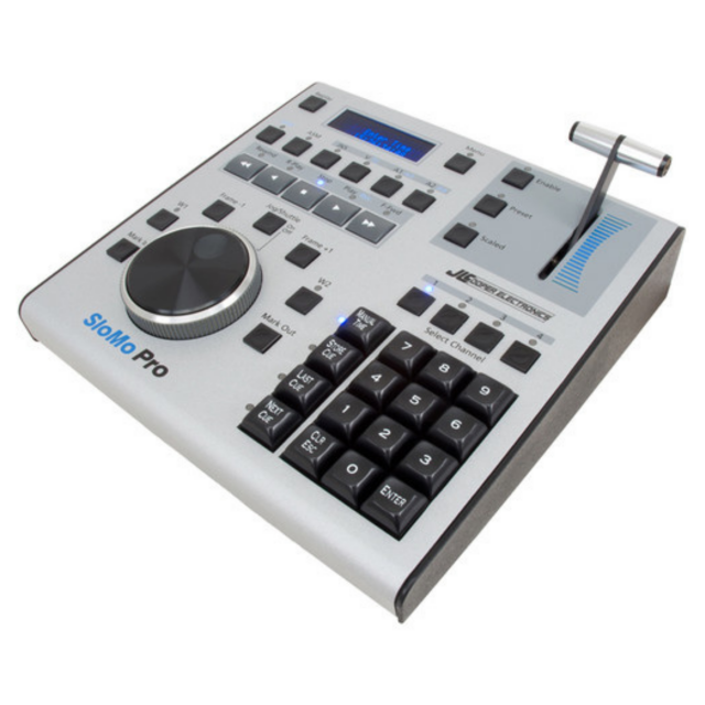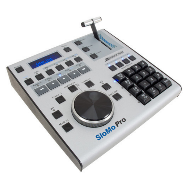 SloMoPro™ USB verfügt über professionelle Transporttasten, JLCs spezielles, optisch kodiertes Jogwheel mit Shuttle-Ring, eine hochwertige T-Bar für Slomo, ein leicht ablesbares 2 x 16 VF-Display, einen vollwertigen numerischen Tastenblock und schnell zugängliche Funktionstasten.