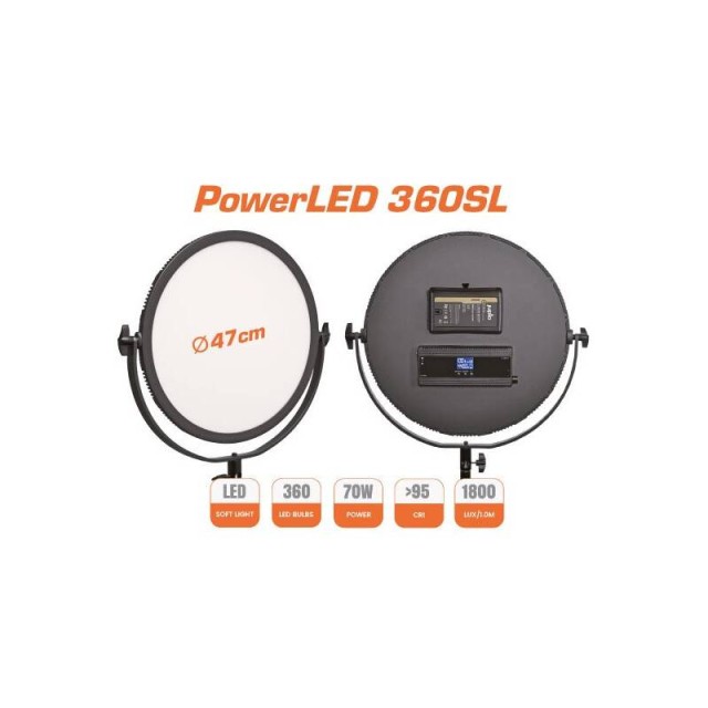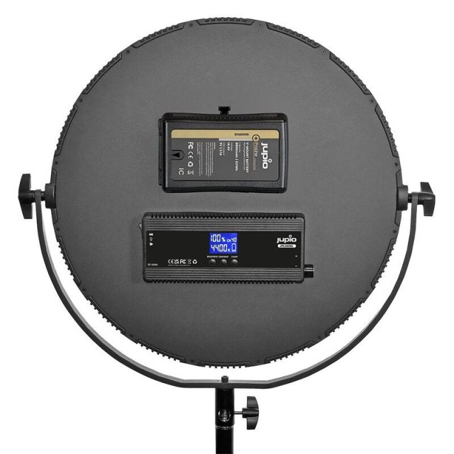 Es handelt sich um eine runde, weiche LED-Leuchte mit einem Durchmesser von 47 cm, die für Foto- und Videoarbeiten geeignet ist. Es hat eine Leistung von 70W und eine Intensität von 1800 lx/m mit 360 LED-Lampen. Die Lichtintensität kann von 0% bis 100% in 1%-Schritten eingestellt werden. Die Farbtemperatur kann in 100-K-Schritten von 3200 K bis 5600 K eingestellt werden. Die Leuchte wird mit einer Fernbedienung und einem Netzadapter geliefert und kann entweder mit 2 Sony NP-F970-Batterien oder einer V-Mount-Batterie betrieben werden. Die Leuchte verfügt über ein übersichtliches Display, das die aktuellen Einstellungen von Helligkeit, Farbtemperatur und Batteriestatus anzeigt. Im Lieferumfang enthalten ist auch ein Stativadapter für die einfache Montage.