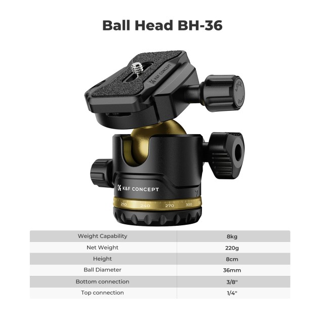 Fortschrittliches Kugelkopf-Design: Der 36 mm große Kugelkopf sorgt für Stabilität und hat eine neue, ölfreie Dämpfung für sanfte und präzise Kamerabewegungen. Die horizontale 360-Grad-Skala an der Basis des Kopfes erleichtert die Panoramafotografie und liefert beeindruckendere Ergebnisse als ein Ultraweitwinkelobjektiv. Der Kugelkopf kann bis zu 8 kg tragen.