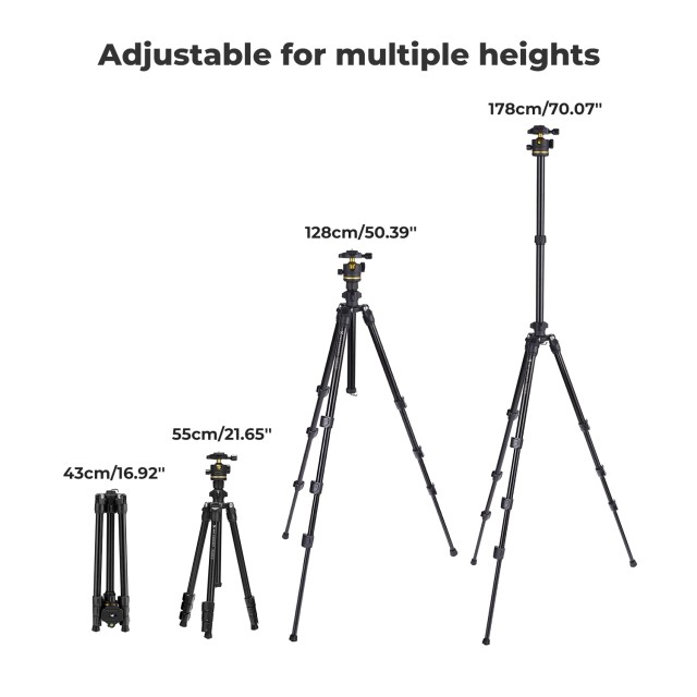 Stabil und verstellbar: Das vierteilige Beindesign sorgt für zuverlässige Stabilität und eine maximale Höhe von 178 cm, die verschiedenen Aufnahmeumgebungen und fotografischen Anforderungen gerecht wird. Das Stativ lässt sich auf nur 430 mm zusammenklappen und passt so leicht in einen Rucksack oder eine Kameratasche.