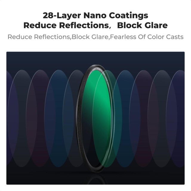 Alle Filter verfügen über importiertes AGC-Hochleistungsoptikglas mit 28-facher Nano-/Mehrfachbeschichtung, das kratzfest, wasserabweisend, ölbeständig und farbtreu ist. Der ultraschlanke, CNC-gefräste Rahmen (1,9–3,33 mm) verhindert Vignettierung bei Weitwinkelobjektiven und gewährleistet gleichzeitig eine reibungslose Montage und Demontage. Eine kompakte Filtertasche für sichere Aufbewahrung und Transport ist im Lieferumfang enthalten.