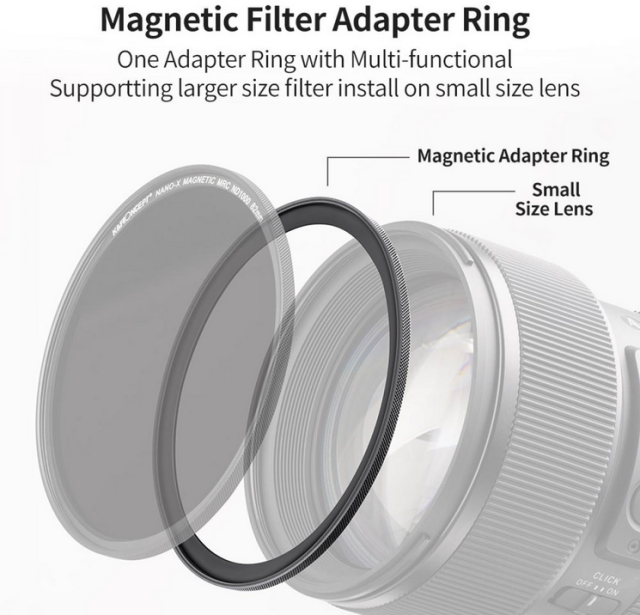 Der K&F 52-82mm Magnetfilter-Adapterring ist eine vielseitige Lösung für die Anpassung größerer Magnetfilter an Objektive mit kleineren Gewindegrößen. Der aus einer Aluminiumlegierung in Luftfahrtqualität gefertigte Adapter ist sowohl stabil als auch stoßfest. Seine mattschwarze Eloxierung verhindert Reflexionen während der Aufnahme. Der Adapter bietet eine stabile Ansaugung für eine schnelle und sichere Montage und Demontage und ist mit allen magnetischen Objektivfiltern von K&F Concept kompatibel. Bitte beachten Sie, dass der Adapter nur mit 82-mm-Magnetfiltern verbunden werden kann und nicht für nicht-magnetische Filter geeignet ist.