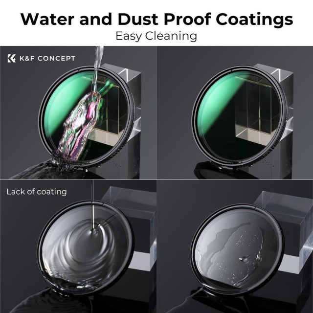- * 【24 Schichten nanobeschichtetes optisches Glas】Dieser ND2-ND32 variable Filter der K&F Concept Nano-Dazzle Serie besteht aus optischem HD AGC-Glas, insgesamt 24 mehrschichtige Beschichtungen helfen, Wasser und Staub abzuweisen und reduzieren effektiv die Reflexion des Filters selbst und die Blendung.Die Oberfläche der Linse ist oxidiert und sandgestrahlt, um effektiv das Eindringen von Streulicht zu verhindern und die Reflexion der Metalloberfläche zu verlangsamen.