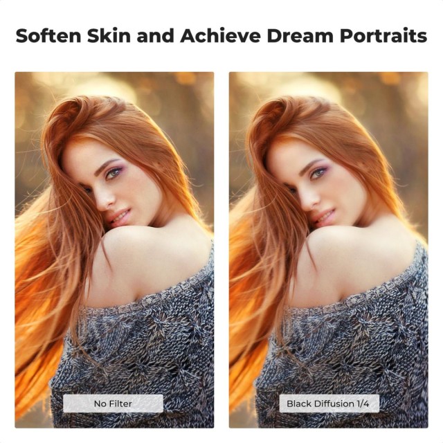 Der Filter Black Mist 1/4 mildert Falten und Hautunreinheiten und lässt die Haut weicher und attraktiver erscheinen. So lässt sich ein sanfter Filmschleier erzielen, der für einen traumhaften Film-Look sorgt. Um eine extrem hohe Bildschärfe zu gewährleisten, wird ein Doppelpolierungsverfahren verwendet, das eine hohe Auflösung bei einer Brennweite von bis zu 550 mm gewährleistet.