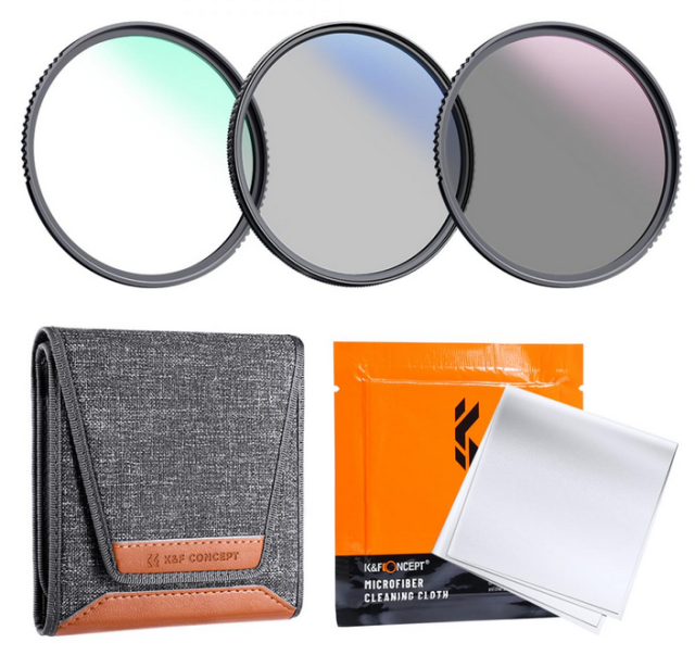 Das K&F 58mm 3pcs Professional Lens Filter Kit enthält einen UV-Filter, einen CPL-Polfilter und einen ND4-Neutraldichtefilter sowie eine Filtertasche und drei Reinigungstücher. Dieses umfassende Kit wurde für eine Vielzahl von Aufnahmesituationen entwickelt, von der Reduzierung von Blendeffekten über die Verbesserung von Farben bis hin zur Steuerung der Belichtung. Es ist ideal für die beliebten 58-mm-Objektive und gewährleistet hochwertige Bilder mit japanischem optischem Glas und einer praktischen Transportlösung.
