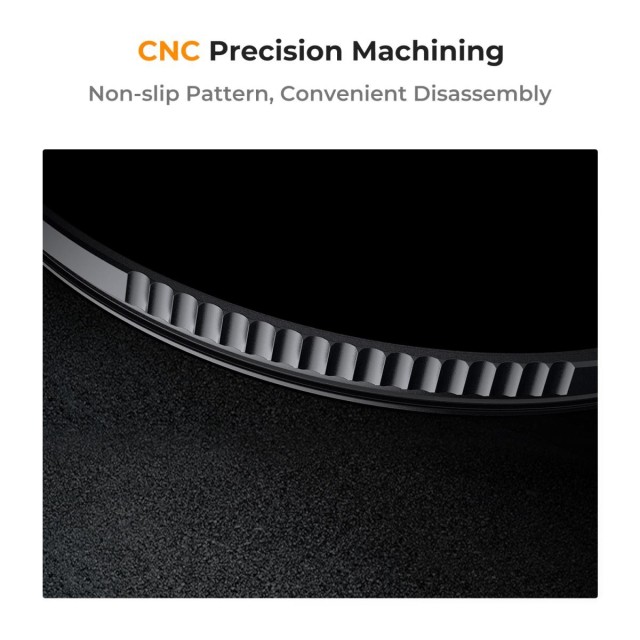 Die gerändelte Textur des Filterrings sorgt für einen sicheren Halt und erleichtert das Anbringen und Abnehmen des Filters. Das leichte und ultraschlanke Rahmendesign verhindert jegliche Vignettierung, selbst bei der Verwendung mit Weitwinkelobjektiven. Der Rahmen ist aus einer Aluminiumlegierung gefertigt, die eine lange Lebensdauer garantiert.