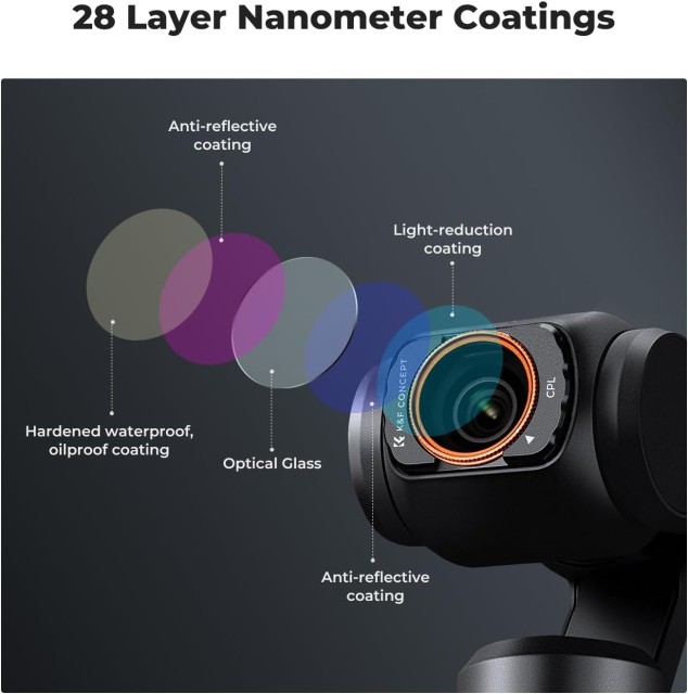 - 【28 Mehrschichtige Beschichtungen Optisches Glas】Jeder Filter aus importiertem AGC optischem Glas, ohne Auswirkungen auf die Bildqualität, gewährleistet die Wiederherstellung der tatsächlichen Farbe des Bildes. Die doppelte Seite des Glases hat eine mehrschichtige Beschichtung, die hilft, Wasser, Staub, Fett und Kratzer abzuwehren. Einfach zu reinigen und zu pflegen, und schützt Ihr Osmo Tasche 3 Objektiv von allen Seiten.