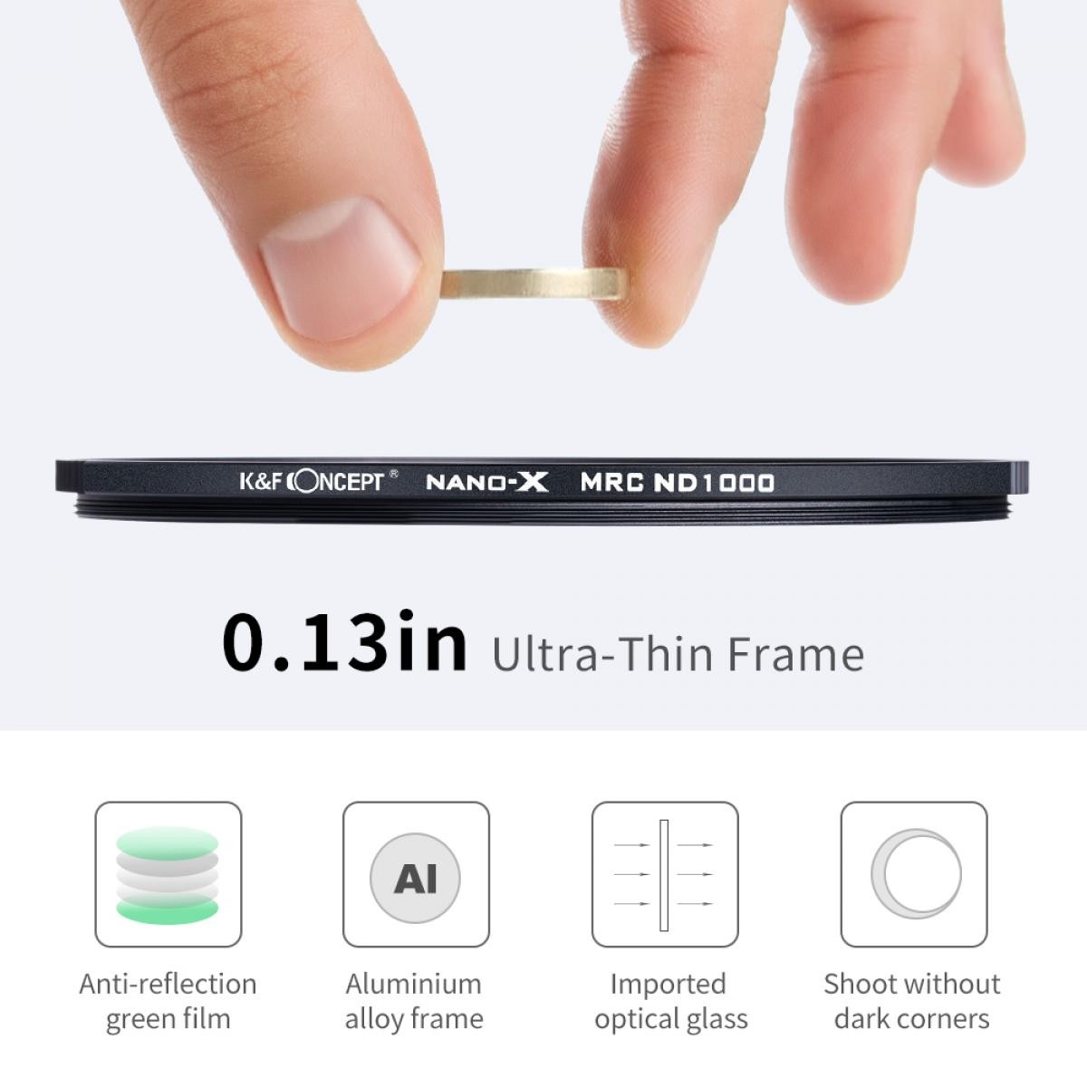 Der K&F 72MM XN26 Nano-X Fixed ND1000 Filter bietet eine echte 10-Stufen-Reduzierung mit hochwertigem optischem Glas, einer mehrfach widerstandsfähigen Nanobeschichtung und einem ultraschlanken Rahmen – ideal für die Aufnahme von gleichmäßigen Langzeitbelichtungseffekten ohne Farbstich.